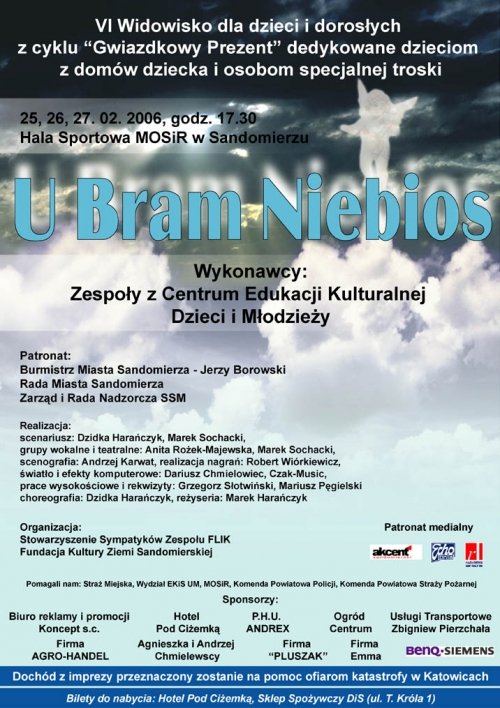 | VI Widowisko z Cyklu 'Gwiazdkowy Prezent' 2006 Dochód z tegorocznego widowiska przeznaczony zostanie na pomoc ofiarom katastrofy w Katowicach Galeria I - Leszka Gospodarczyka I część - http://83.15.104.67%20/leszek/Reporterka%20Flik.htm II część - http://83.15.104.67%20/leszek/Reporterka%20Flik%202.htm