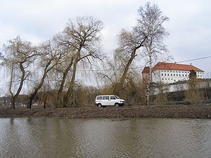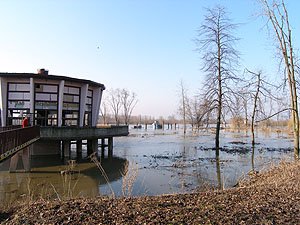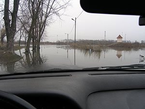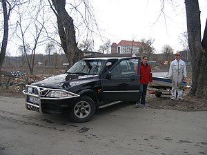 | Wczoraj byliśmy w hangarze pontonem, dzisiaj sprawdzamy, czy nie dałoby się dojechać samochodem. | Niestety nie, wycofaliśmy się mając wodę w progach. Może uda się z drugiej strony ... |