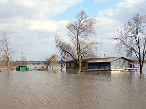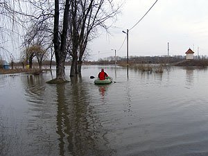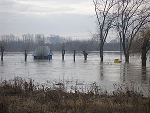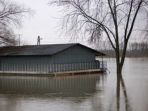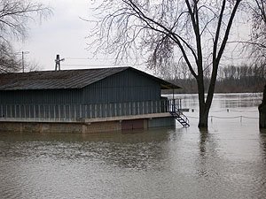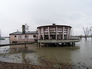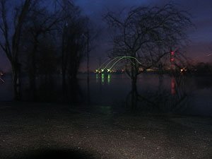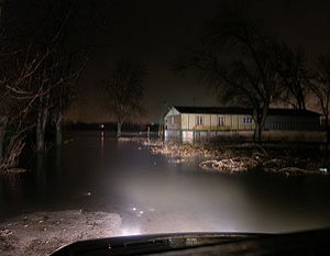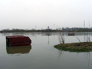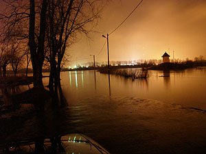 | Godz. 20.00. Woda podchodzi w górę Bulwaru. Wodowskaz wskazuje 20 cm wody więcej niż o godz. 16.00. | Godz. 20.00 Do naszego hangaru można dostać się już tylko pontonem. Na drodze też trzeba uważać. Jednym kołem wylądowałem w wodzie i skończyło się wyciąganiem samochodu na holu. |