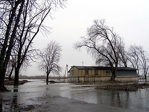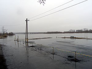 | Godz. 16.00. Widok w stronę mostu. | Godz. 16.00. Do hangaru niedługo będzie można dostać się tylko wodą. |
