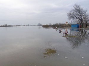 | Godz. 08.00. Ławeczki przy Bulwarze coraz mniej wystają z wody. | Godz. 08.00. Zbliżenie na ławeczki. |