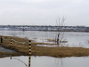 | Godz. 10.30. Ławeczki przy Bulwarze stoją w wodzie. | Godz. 10.30. Widok na most. Krzaki, które wczoraj rosły na suchej ziemi, dziś stoją w nurcie Wisły. |