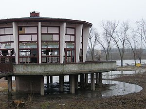 | Godz. 08.30. Poziom wody przekroczył 7 metrów. | Godz. 08.30. Na Bulwarze widać już tylko szczyt sklepiku spożywczego. |