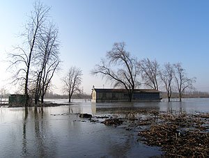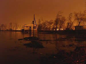 | Godz. 15.30. Górna część hangaru ciągle ponad wodą. | Godz. 21.00. Woda ciągle podnosi się. |
