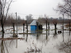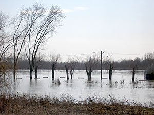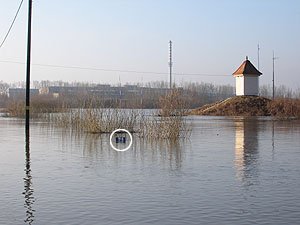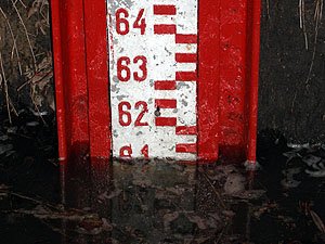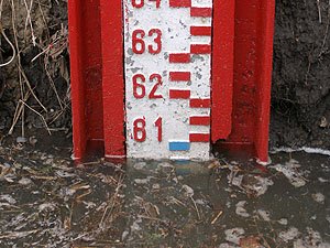 | Godz. 08.00. Wodowskaz ledwo wystaje ponad wodę. | Godz. 08.00. Okrąglak stoi w wodzie. |