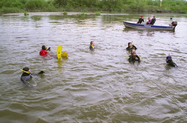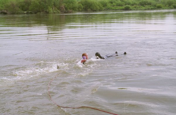 | Ratownik sam musi zadbać o swoje bezpieczeństwo, tutaj asekuracja liną z brzegu. |