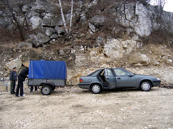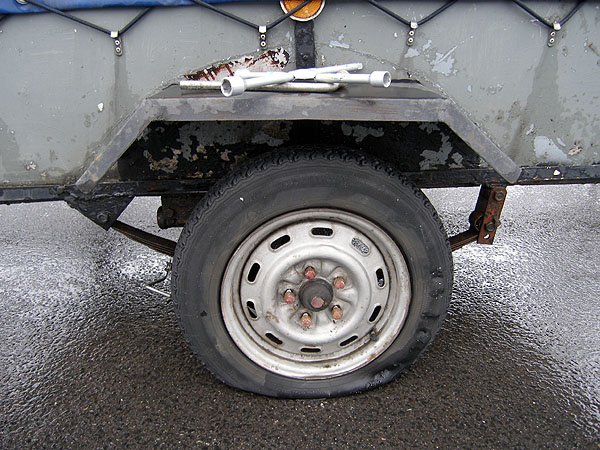 | Podróż do Krakowa mija spokojnie nie licząc słowotoku Joanny, musieliśmy z Długim uciszać ją prawie siłą. A w Krakowie ... jak na zdjęciu. W pożyczonej przyczepce nie ma zapasu, są święta, wszystko zamknięte. Znajomi z Krakowa obdzwaniają serwisy i znajdują czynny warsztat. Trzeba zdjąć koło i pojechać na drugą stronę Krakowa. Zajmie to trochę czasu, ale ważne, że będziemy mieli koło. |