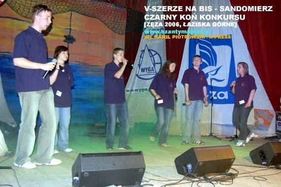 'ZĘZA' 2006 W dniach 5-6 maja w Łaziskach Górnych, w tamtejszym Miejskim Domu Kultury, odbędzie się piąty, jubileuszowy Ogólnopolski Festiwal Piosenki Żeglarskiej 'Zęza'. Co roku w ramach festiwalu przeprowadzany jest konkurs, w którym uczestniczyć mogą zespoły amatorskie, dla których występ na Zęzie jest ogromną szansą pokazania się i wypłynięcia na głębsze wody. Z wielką więc satysfakcją i z dumą w sercu powiadamiam, że Nasi V-szerze Na Bis zaśpiewają na tym słynnym festiwalu i z tego co od nich usłyszałem, planują wyrzucić pozostałe zespoły za burtę.