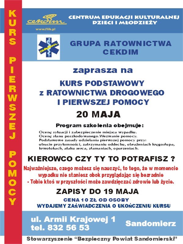 KURS PIERWSZEJ POMOCY W dniach 27-29 stycznia Grupa Ratownictwa PCK Sandomierz (która oczywiście jest jedną z form CEKDiMu) przeprowadzi Kurs Pierwszej Pomocy. Kurs obejmuje zarówno ćwiczenia praktyczne jak i część teotretyczną, łącznie 16 godzin nauki udzielania pierwszej pomocy. Uczestnicy kursu muszą mieć ukończone 16 lat. Kurs odbywać się będzie w CEKDiM przy ul.Armii Krajowej 1 a rozpocznie się 27 stycznia o godzinie 16. W sobotę 21 stycznia odbędzie się wyjazd połączonych grup (pierwszej i drugiej) formacji tanecznej 'Flik' do Warszawy. Celem podrózy jest obejrzenie w Teatrze Muzycznym 'ROMA' znakomitego spektaklu, który stał się wielkim przebojem na całym świecie- musicalu pt. 'Taniec Wampirów'. Spotykamy się na parkingu przed klubem o godzinie 08.00