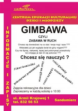 GIMBAWA, czyli zabawa w ruch, jest propozycją zajęć rekreacyjnych dla dzieci,opartych na autorskim programie, którego najistotniejszym założeniem jest propagowanie wśród najmłodszych postawy trwałego zainteresowania aktywnością fizyczną. Cel ten zamierzamy osiągnąć przede wszystkim poprzez atrakcyjność zajęć, w których akcent kładziony jest na bogatą różnorodność ćwiczeń gimnastycznych i zabaw ruchowych odbywających się w przyjaznej, miłej i wesołej atmosferze z wykorzystaniem wielu dziwnych przyrządów. Zajęcia w każdą sobotę o godzinie 10:00 prowadzi Zbyszek 'Fikołek' Jurek.