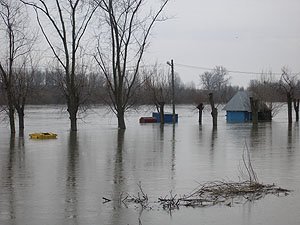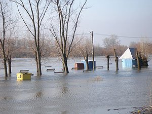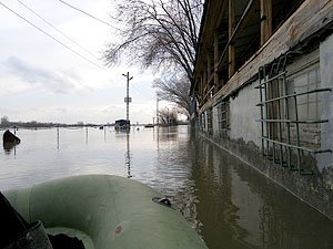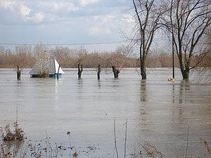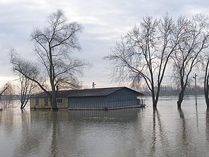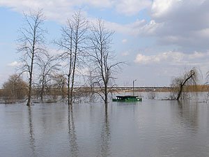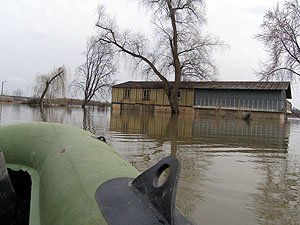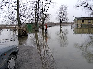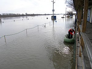 | Godz. 20.00. Woda podchodzi w górę Bulwaru. Wodowskaz wskazuje 20 cm wody więcej niż o godz. 16.00. | Godz. 20.00 Do naszego hangaru można dostać się już tylko pontonem. Na drodze też trzeba uważać. Jednym kołem wylądowałem w wodzie i skończyło się wyciąganiem samochodu na holu. |