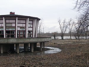 | Godz. 08.30. Poziom wody przekroczył 7 metrów. | Godz. 08.30. Na Bulwarze widać już tylko szczyt sklepiku spożywczego. |