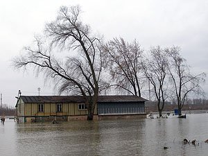 | Godz. 15.30. Górna część hangaru ciągle ponad wodą. | Godz. 21.00. Woda ciągle podnosi się. |