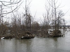 | Godz. 12.00. Górna część hangaru ciągle ponad wodą. | Godz. 12.00. To samo z bliska. |