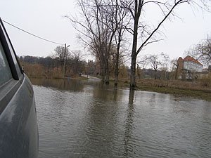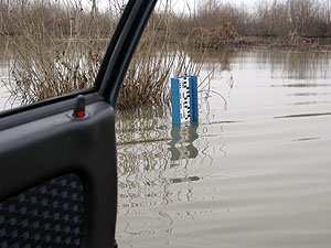 | Wczoraj byliśmy w hangarze pontonem, dzisiaj sprawdzamy, czy nie dałoby się dojechać samochodem. | Niestety nie, wycofaliśmy się mając wodę w progach. Może uda się z drugiej strony ... |