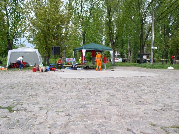 | Na Bulwarze rozkładają sprzęt ratownicy medyczni, obok instalujemy nagłośnienie. |