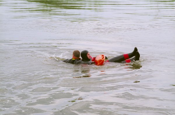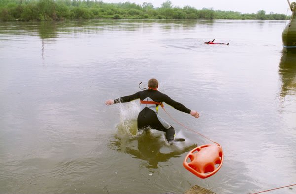 | Ratownik sam musi zadbać o swoje bezpieczeństwo, tutaj asekuracja liną z brzegu. |