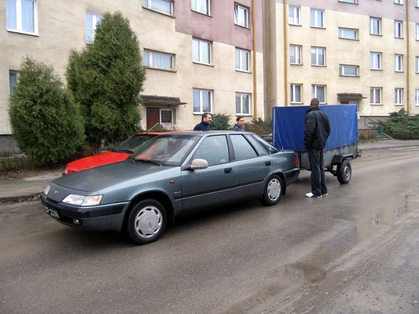 | Podróż do Krakowa mija spokojnie nie licząc słowotoku Joanny, musieliśmy z Długim uciszać ją prawie siłą. A w Krakowie ... jak na zdjęciu. W pożyczonej przyczepce nie ma zapasu, są święta, wszystko zamknięte. Znajomi z Krakowa obdzwaniają serwisy i znajdują czynny warsztat. Trzeba zdjąć koło i pojechać na drugą stronę Krakowa. Zajmie to trochę czasu, ale ważne, że będziemy mieli koło. |
